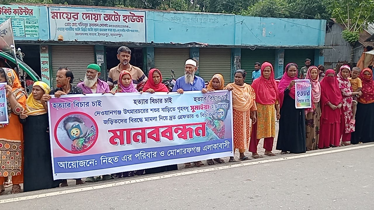 মঙ্গলবার ( ১৬ সেপ্টেম্বর ) দুপুরের দেওয়ানগঞ্জ- ইসলামপুর মহাসড়কের মোশারফগঞ্জ বাজারে নিহতের স্বজন- এলাকাবাসী মানববন্ধনটি আয়োজন করে।