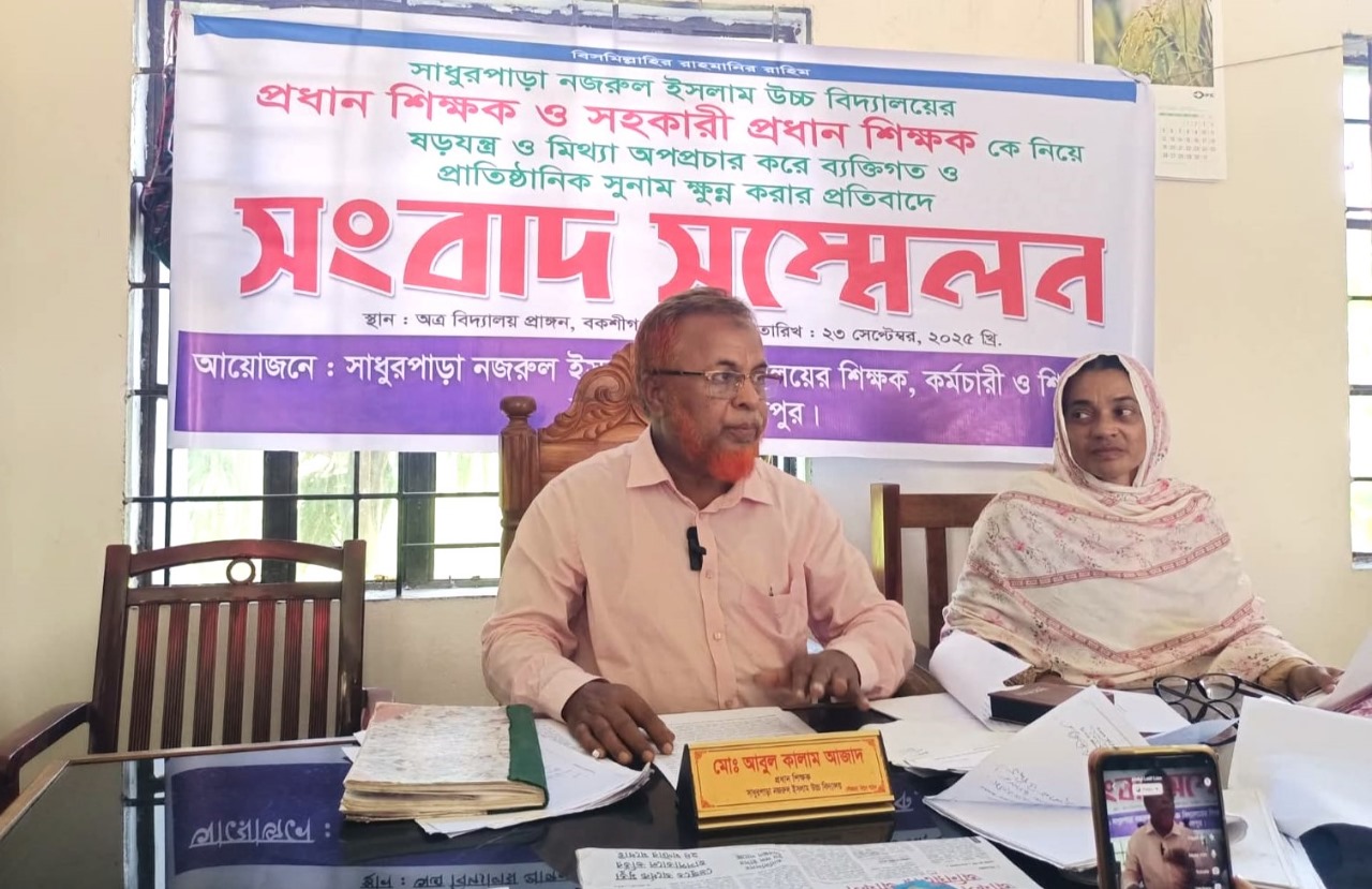 মতিন রহমান, বকশীগঞ্জ; জামালপুরের বকশীগঞ্জ উপজেলার সাধুরপাড়া নজরুল ইসলাম উচ্চ বিদ্যালয়ের প্রধান শিক্ষক আবুল কালাম আজাদ ও তার শ্যালিকা সহকারী প্রধান শিক্ষক শরিফা আক্তার নিজেদের বিরুদ্ধে ওঠা দুর্নীতি ও অনিয়ম থেকে বাঁচতে আইন বহির্ভূতভাবে স্কুল কার্যালয়ে সংবাদ সম্মেলন করেছেন। এ ঘটনাকে সম্পূর্ণ বেআইনি আখ্যা দিয়ে উপজেলা নির্বাহী অফিসারের কাছে লিখিত অভিযোগ দিয়েছেন এলাকাবাসী।