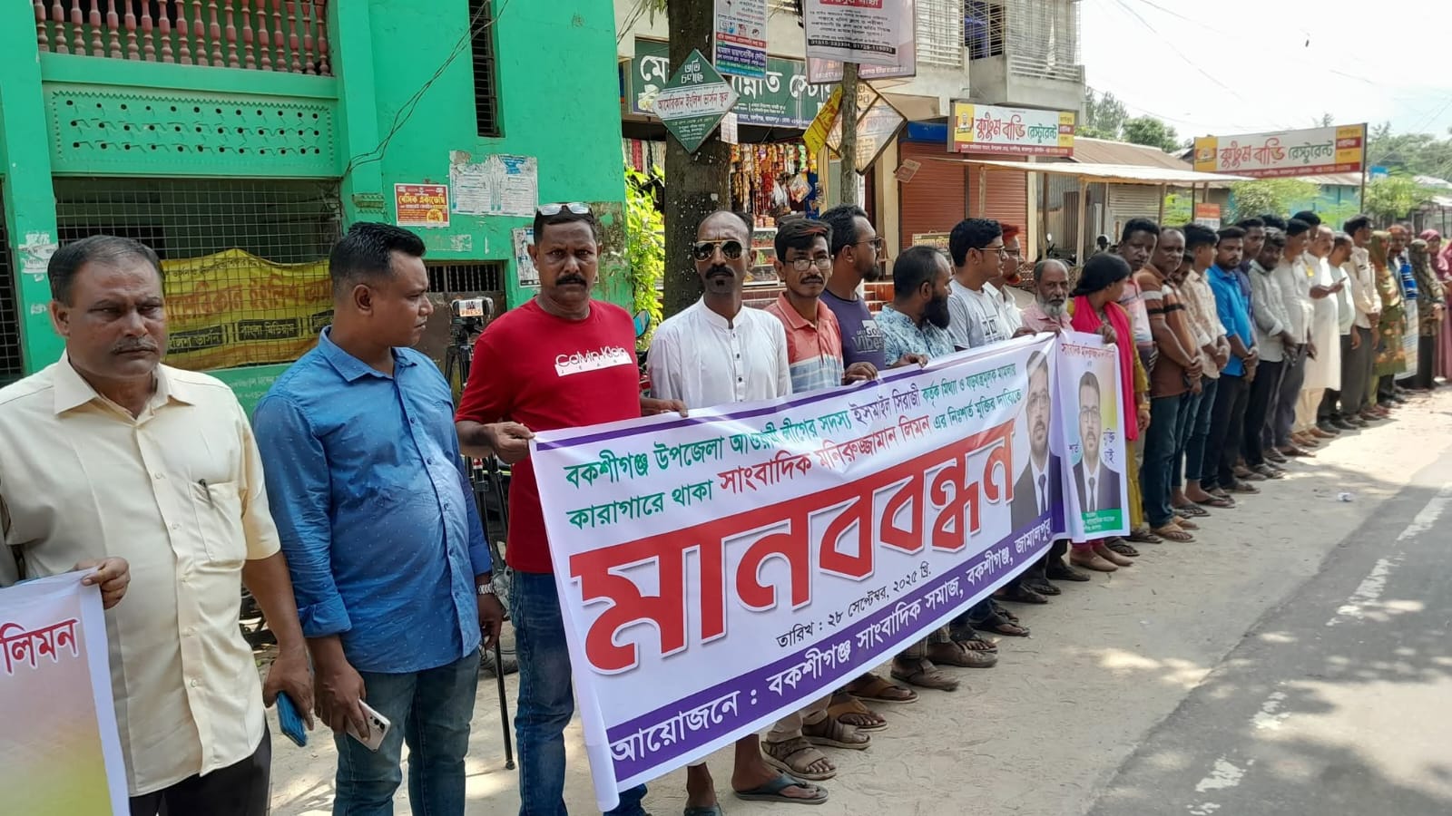 রোববার (২৮ সেপ্টেম্বর) সকাল ১১টায় বকশীগঞ্জ উপজেলা পরিষদের সামনে সাংবাদিক সমাজের উদ্যোগে এই মানববন্ধন অনুষ্ঠিত হয়। এতে স্থানীয় সাংবাদিকসহ বিভিন্ন সংগঠনের নেতারা অংশ নেন।