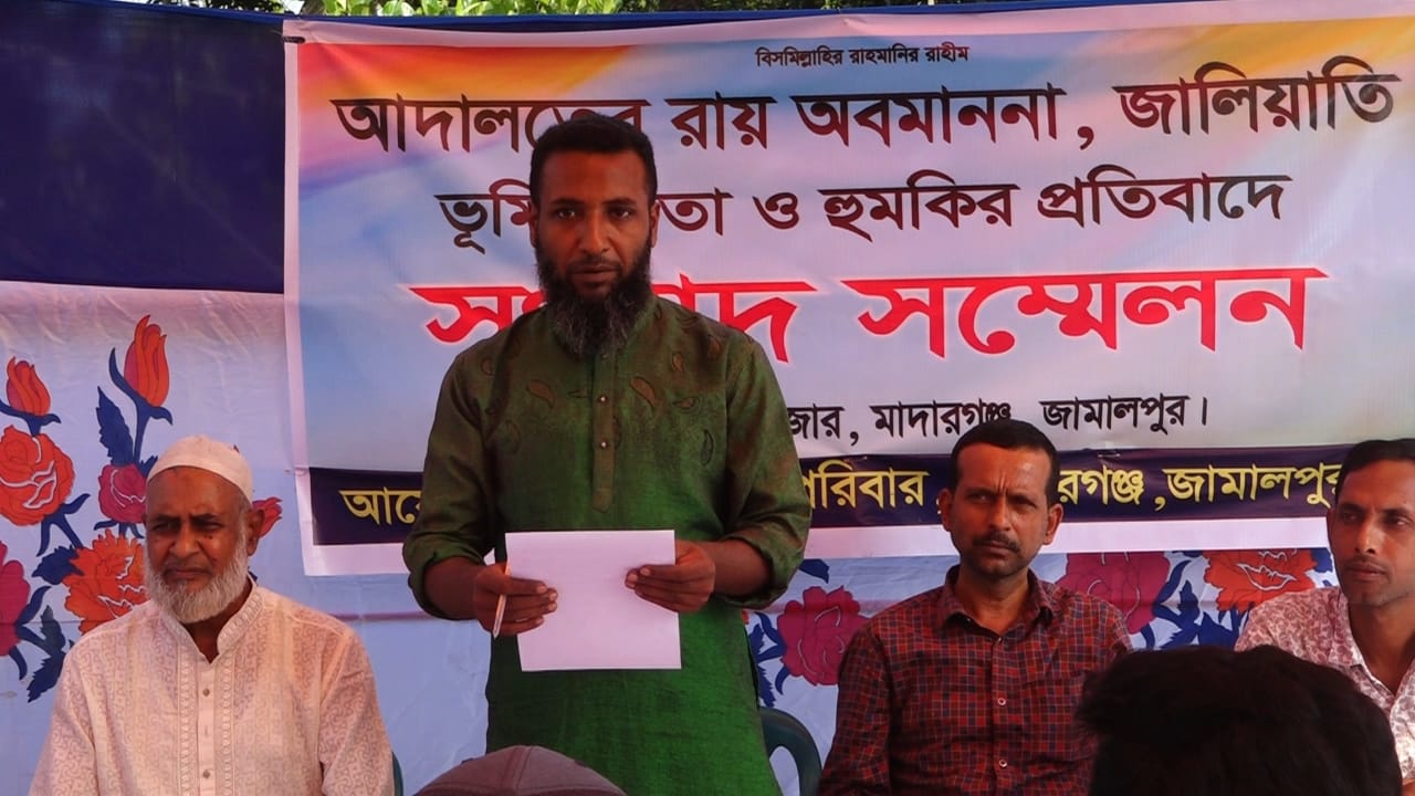 এসময় তিনি বলেন- ১৯৬০ সাল থেকে বালিজুড়ী এলাকার ৩৮ শতাংশ জমিতে বসবাস করে আসছে তার পূর্বপুরুষ। সেই জমি ১৯৮৬ সালে মো: ইস্রাফিল শেখের নামে ভূমিহীন হিসেবে রেজিস্ট্রি কবুলিয়ত করে বাংলাদেশ সরকার। কিন্তু সেই জমি নিজেদের বলে দাবি করে ২০০৭ সালে মামলা করে একটি পক্ষ। সেই মামলায় ইস্রাফিল শেখের ওয়ারিশদের পক্ষে রায় দেন নিম্ন আদালত, উচ্চ আদালত ও সুপ্রীম কোর্ট। সেই রায় অবমাননা করে একটি চক্রের সাহায্যে চলতি বছরের জুলাই মাসের ১৮ থেকে ২০ তারিখের মধ্যে সাড়ে ২৮ শতাংশ জমি নামজারী করা হয় প্রতিপক্ষ চারজনের নামে। এতে একই জমি দুই পক্ষের নামে নামজারী করা হয়। সেই সময় মাদারগঞ্জে বালিজুড়ী ইউনিয়ন ভূমি সহকারী কর্মকর্তা পদে সাদেকুর রহমান, সাব-রেজিষ্টার পদে মো: আবু কালাম, সহকারি কমিশনার (ভূমি) সায়েদা খানম লিজা দায়িত্বে ছিলেন। বর্তমানে সাব রেজিষ্ট্রার বাদে সকলে বদলি হয়েছেন অন্যত্র।
