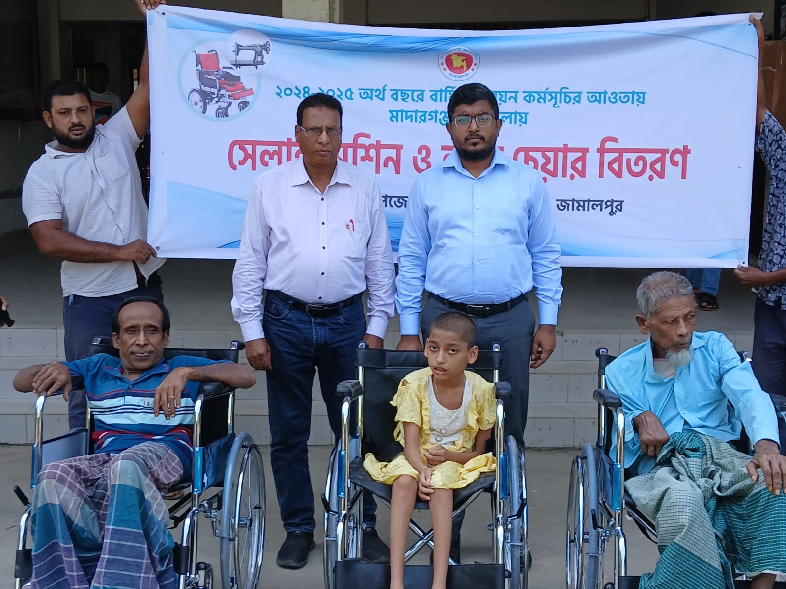 মাদারগঞ্জে সেলাই মেশিন ও হুইলচেয়ার বিতরণ