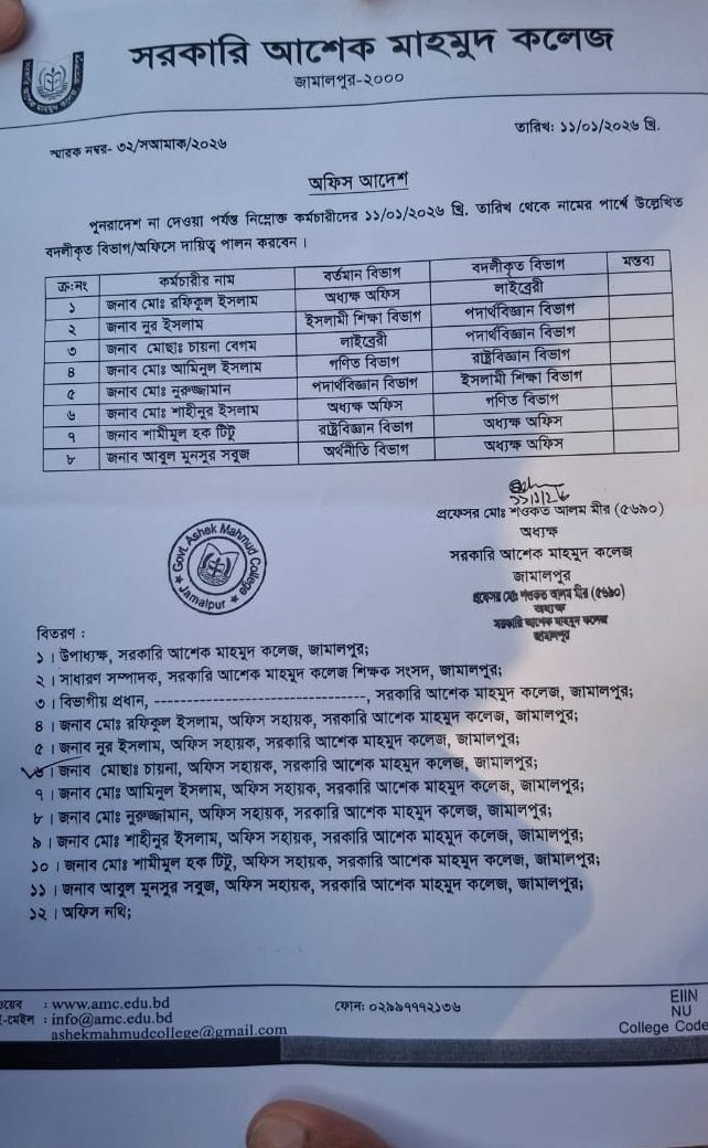 কলেজ থেকে জানা যায়, গত ১১ জানুয়ারি কলেজ অধ্যক্ষের স্বাক্ষরে একটি বদলি সংক্রান্ত নোটিশ জারি করা হয়। ওই নোটিশে কলেজের বিভিন্ন বিভাগ ও অফিস থেকে মোট ৮ জন কর্মচারীকে এক বিভাগ থেকে অন্য বিভাগে বদলি করা হয়।