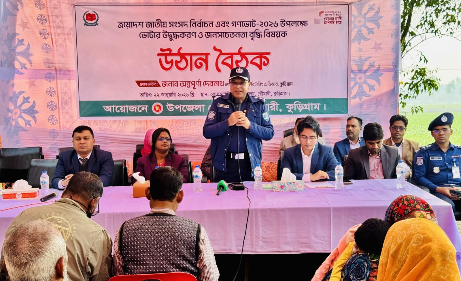 উঠান বৈঠকে রৌমারী উপজেলা নির্বাহী অফিসার আলাউদ্দিন এর সভাপতিত্বে প্রধান অতিথি হিসেবে উপস্থিত ছিলেন কুড়িগ্রাম জেলার জেলা প্রশাসক ও রিটার্নিং অফিসার মিজ অন্নপূর্ণা দেবনাথ।